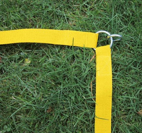 Het vak wordt geleverd inclusief ringen op de hoeken met daaraan vast de haringen om het vak in het gras vast te prikken.